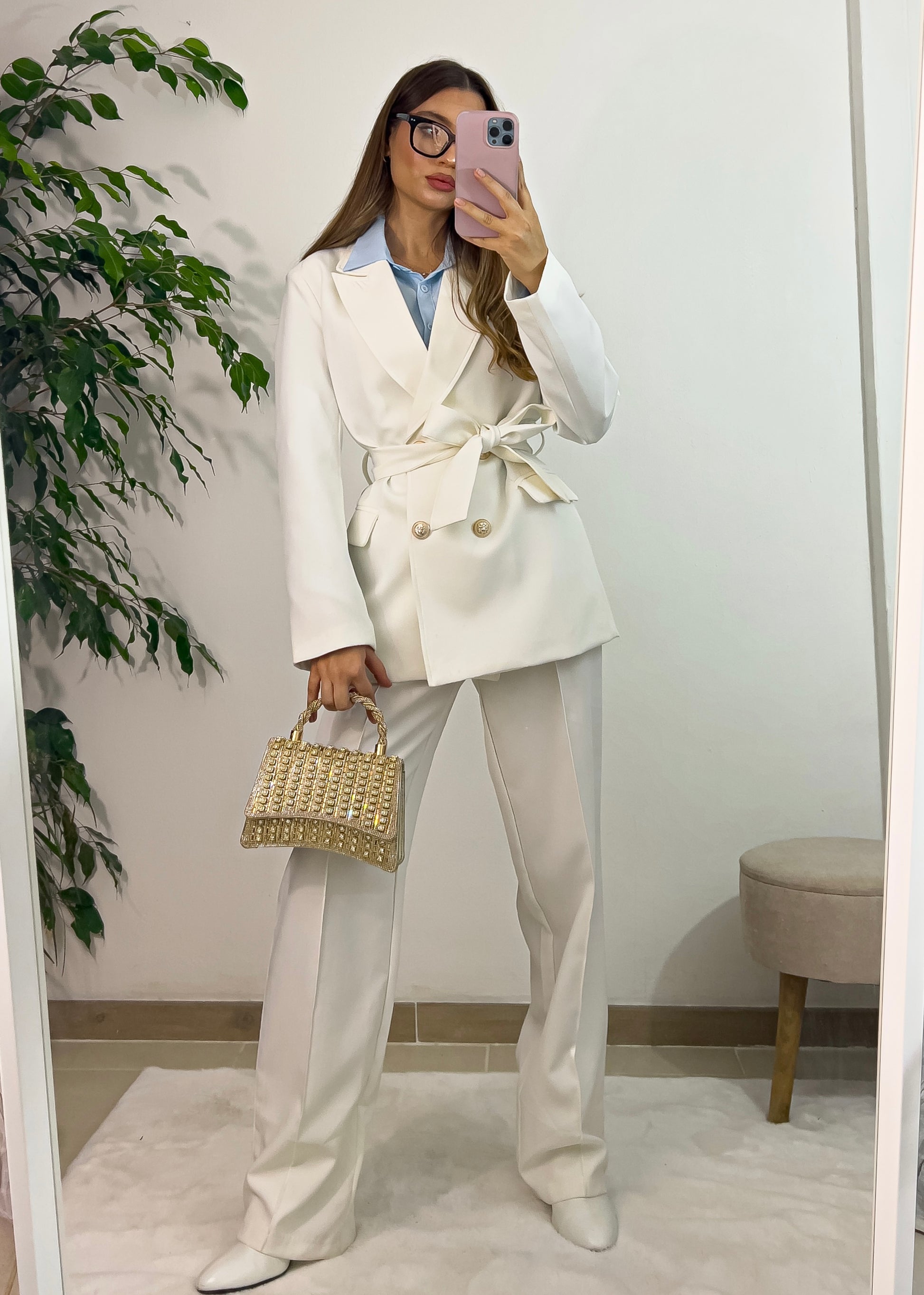 Esprimi una dichiarazione di moda raffinata e sofisticata con il Completo Toral White. Questo blazer bianco total white è perfetto per ogni occasione, che sia un evento formale o informale. La sua eleganza senza tempo e il taglio impeccabile ti faranno sentire sicura e professionale tutto il giorno. Fatti notare con stile e classe con il Completo Toral White.