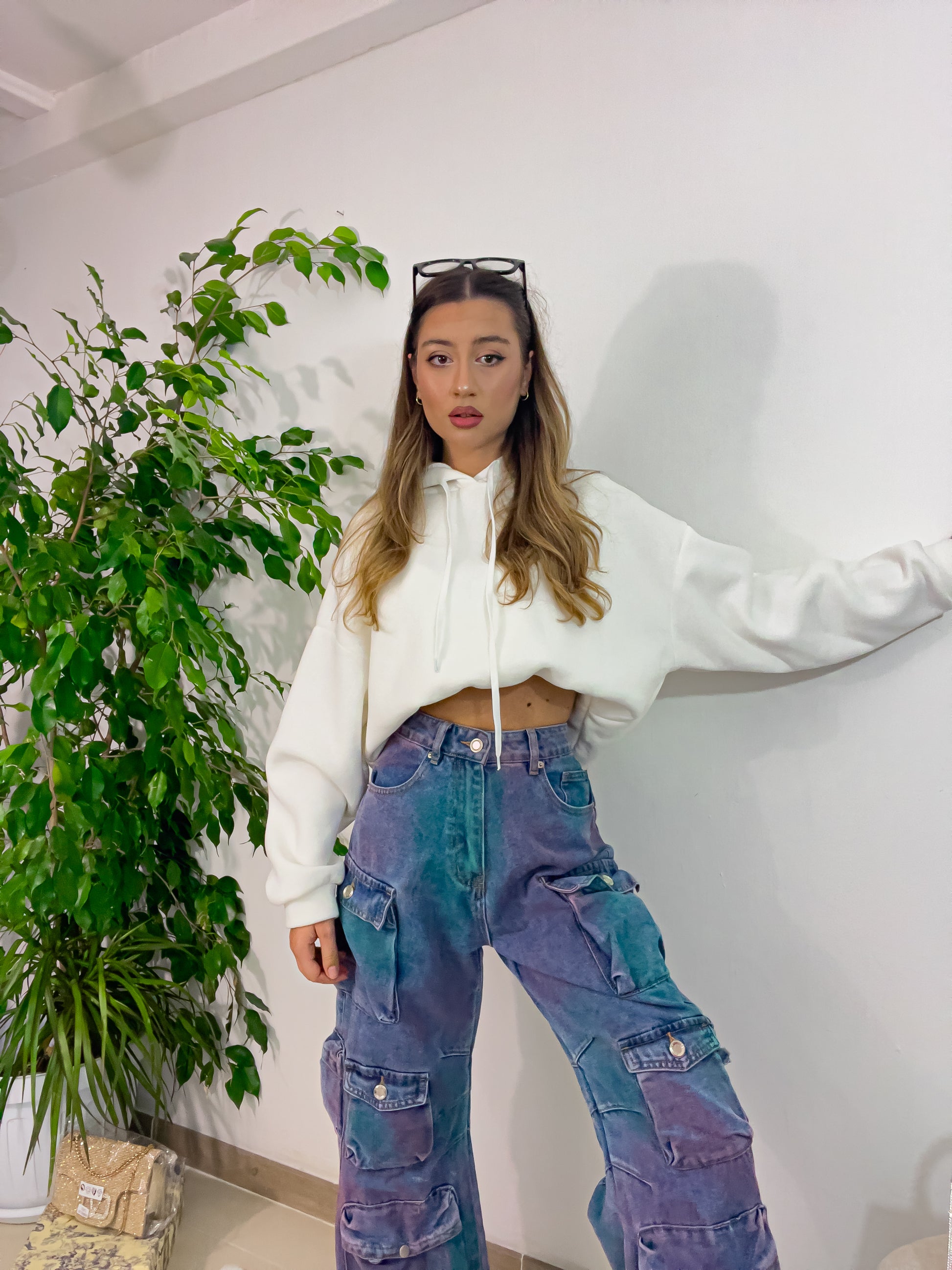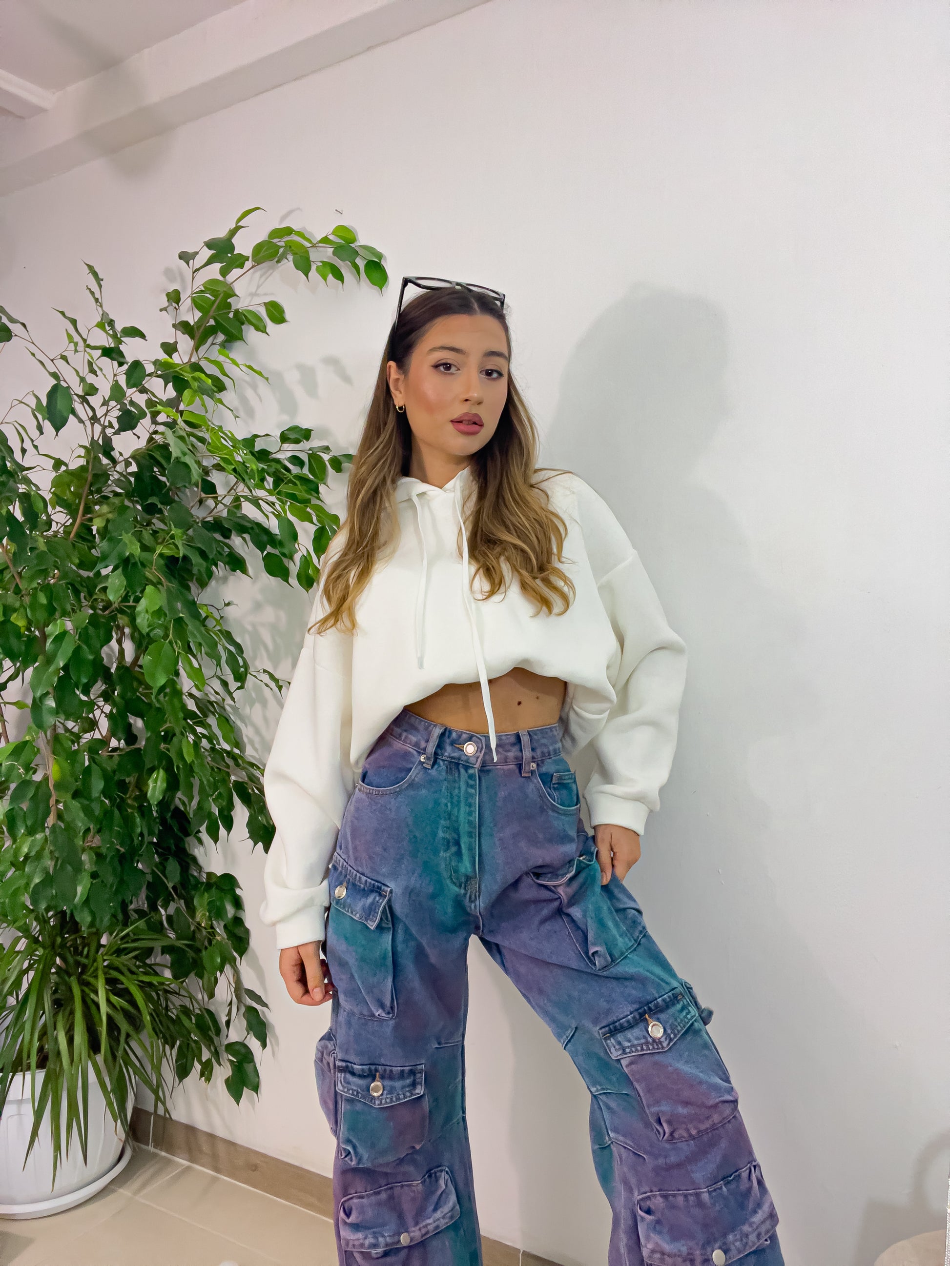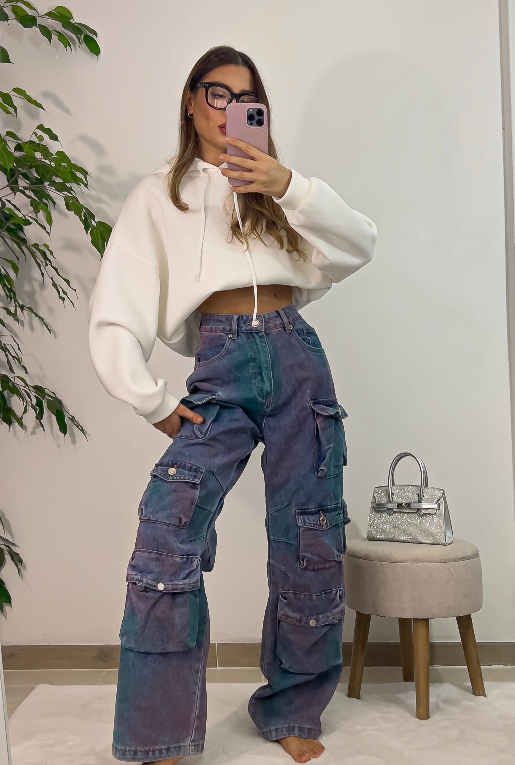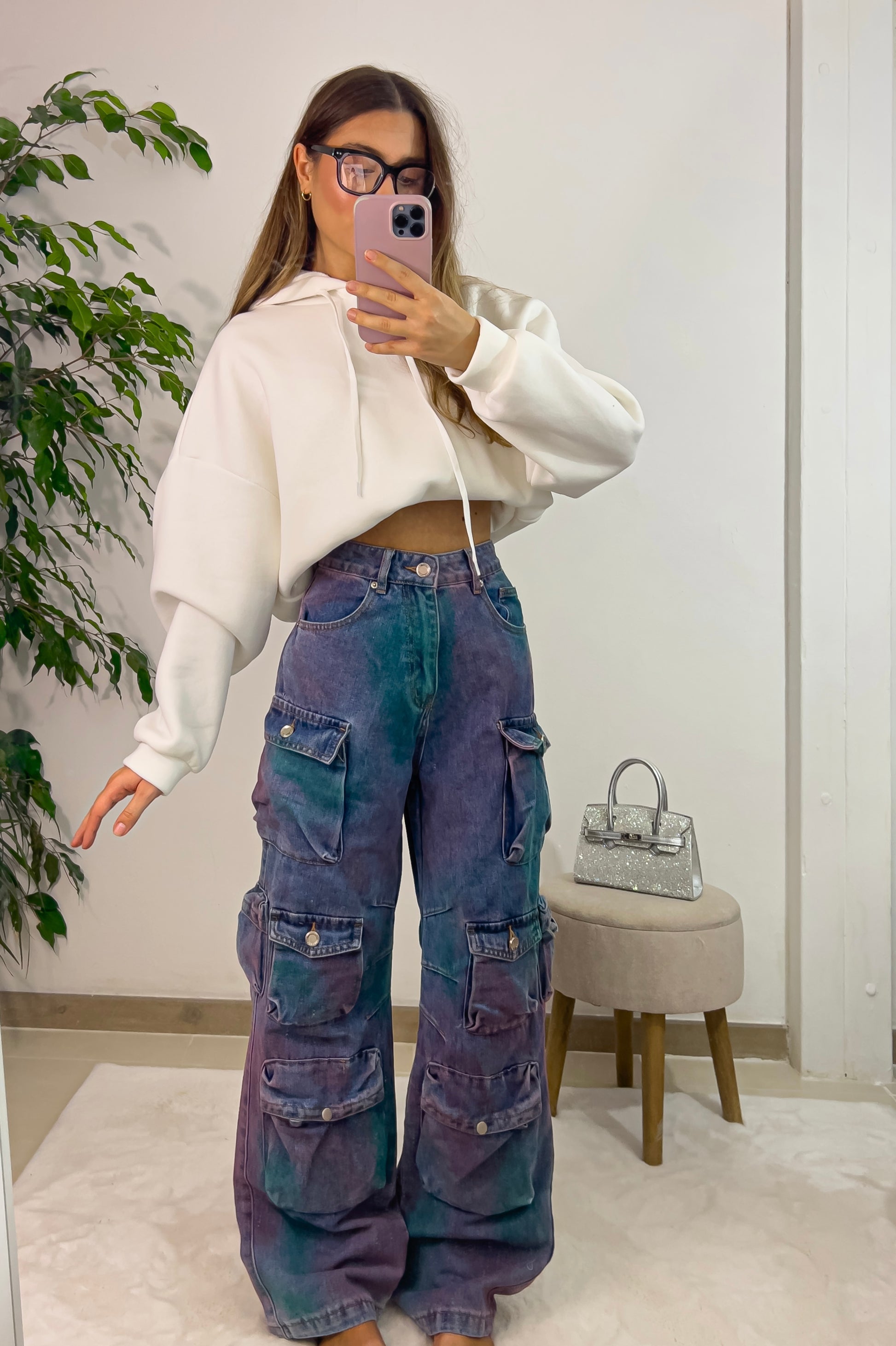 Jeans Cargo Slavati, perfetti per uno stile casual ma di tendenza. Realizzati con un mix di colori blu e viola, questi jeans slavati sono arricchiti da tasche cargo per un look moderno e funzionale. Confortevoli e alla moda, sono l'ideale per le tue giornate all'aria aperta o per un look da città cool e rilassato.