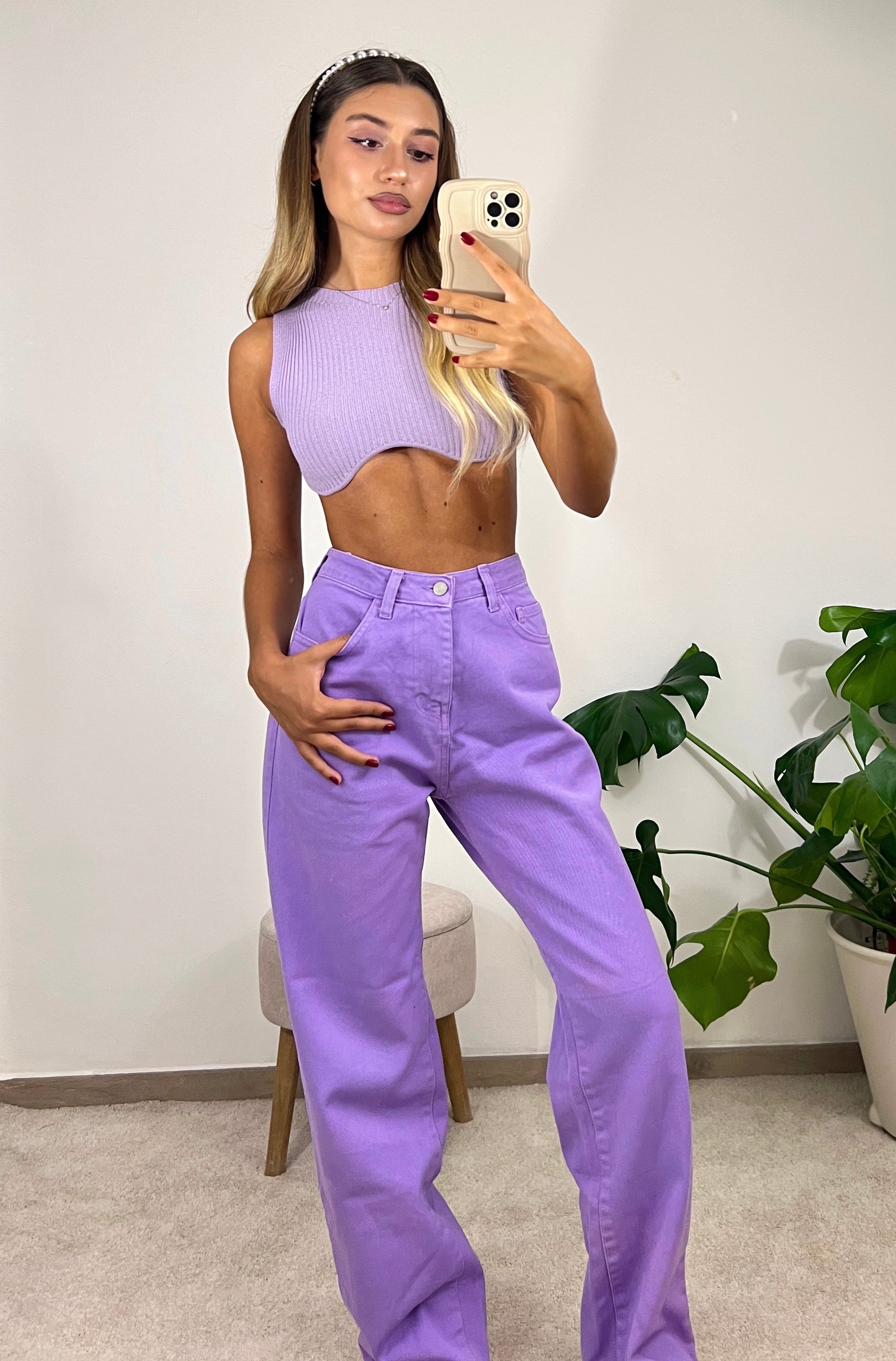 Jeans Wide Leg Viola, l'ultima tendenza moda! Realizzati con un tessuto viola di alta qualità, questi jeans donano una vestibilità ampia e confortevole, ideale per qualsiasi occasione. Aggiungi un tocco di colore al tuo guardaroba con i nostri jeans viola e sfoggia uno stile unico e alla moda.